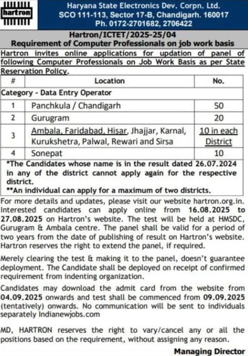 इस भर्ती का आयोजन हरियाणा स्टेट इलेक्ट्रॉनिक्स डेवलपमेंट कॉरपोरेशन के द्वारा किया गया है। आवेदन करने का तरीका ऑनलाइन रहने वाला है कुल रिक्त पदों की संख्या 170 है। पद का नाम टाटा एंट्री ऑपरेटर (ने DEO), आवेदन करने का अंतिम तिथि 27 अगस्त 2025, इसके आधिकारिक वेबसाइट www.hartron.org.in अंतिम तिथि से पहले इसी वेबसाइट के माध्यम से फॉर्म को भरना है।